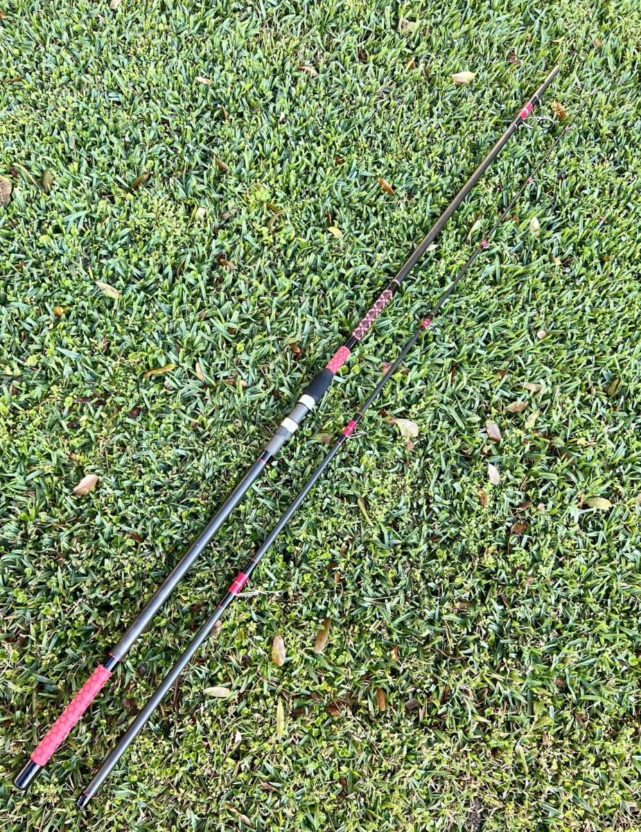 11′ P2000, Equal Sections, 23.5″ to Start of Fuji Regular Reel Seat, Red Fishscale Heatshrink Fore with Short Foam Foregrip, Red Fishscale Heatshrink Butt Grip, Approx. 33.″ from front of reel seat to center of first guide, Fuji Frosted Silver Alconite Double Foot Guides 30-8 Guides, . Rated for 2-4 oz. This rod can be shipped, please select either Local Pickup or Flat Rate Shipping when purchasing.