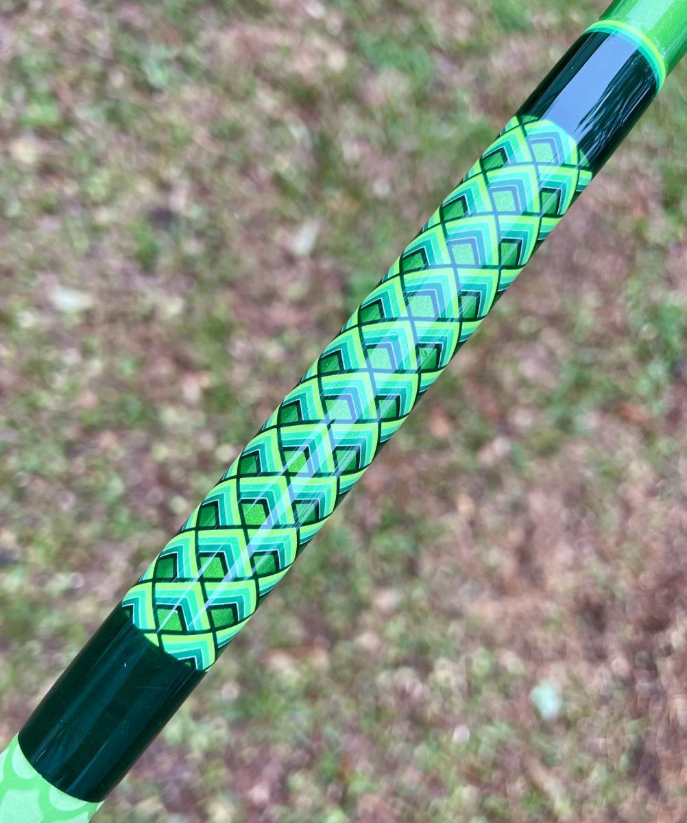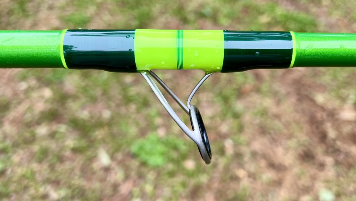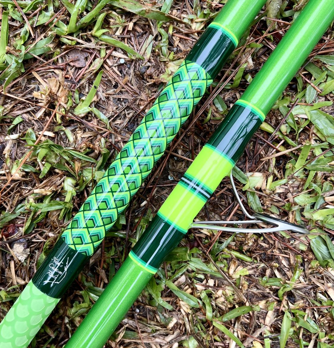 13′ Mamba, Unequal Sections, Tip Section is 94″ and the Butt Section is 67″. Fuji Regular Reel Seat (26.5″ to Start), Fuji CCKWAG30-10 Guides, 41″ from Reel Face to First Guide, Foam Fore Grip & Green Fishscale Fore & Butt Grip. Rated for 3-6 oz. This rod can be shipped, please select either Local Pickup or Flat Rate Shipping when purchasing.