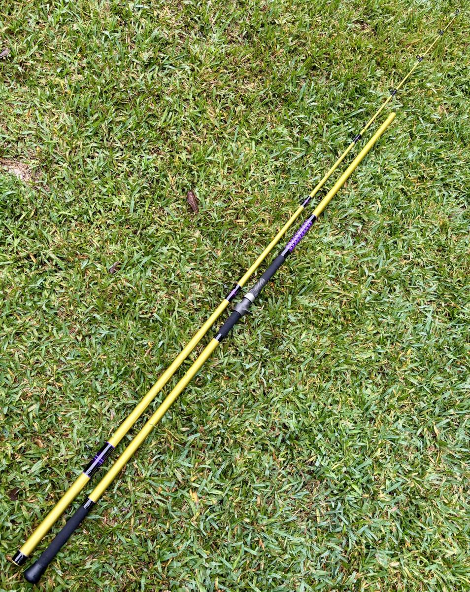 13′ Aspen, Unequal Sections, Tip Section is 7’10” and the Butt Section is 5’7″. Fuji Trigger Reel Seat (29.5″ to start), Fuji BBMNAG 25-12 Guides, NonFlock Fore & Split Rear Heatshrink Grips. Rated for 6-10oz. This rod can be shipped, please select either Local Pickup or Flat Rate Shipping when purchasing.