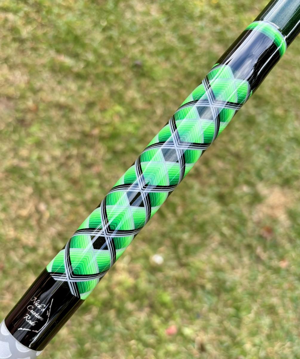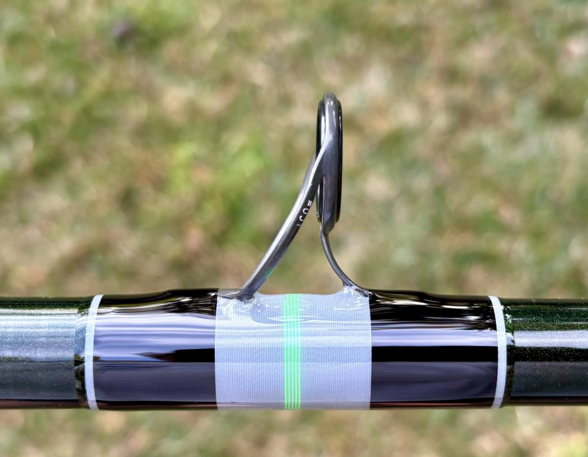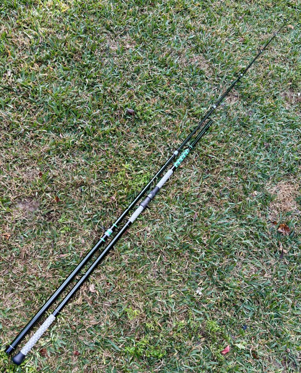 13′ Chameleon Gold Green, Unequal Sections, Tip Section is 106″ and the Butt Section is 55.25″. Fuji Trigger Reel Seat (29.5″ to start), Fuji Dark Gray Alconite Guides 25-12, Gray Fishscale Heatshrink Fore & Split Butt Grips. Rated for 6-10oz. PLEASE SELECT LOCAL PICKUP WHEN PURCHASING THIS ROD. If you are interested in having this item shipped, message us.
