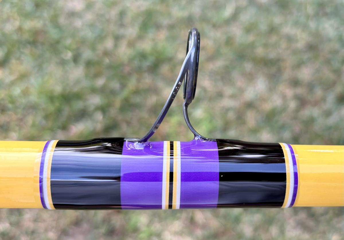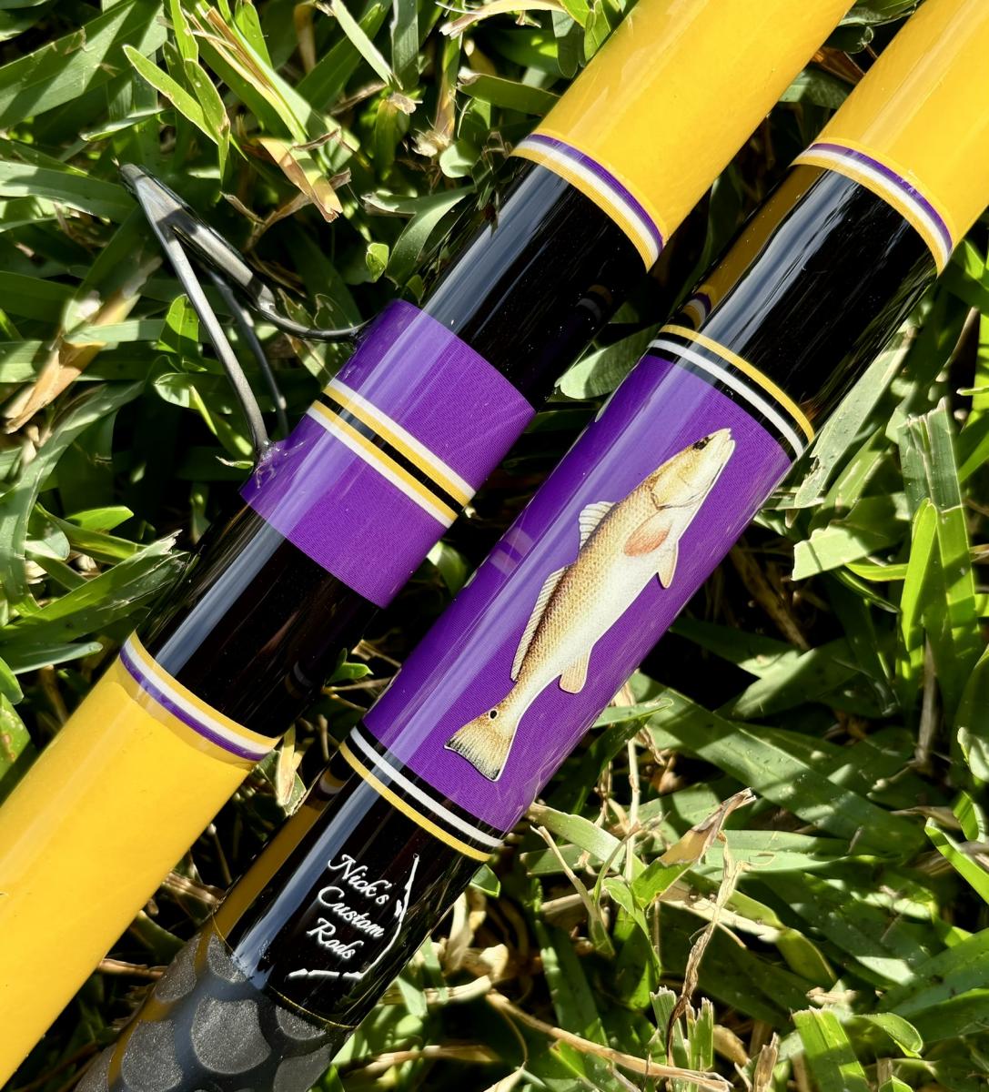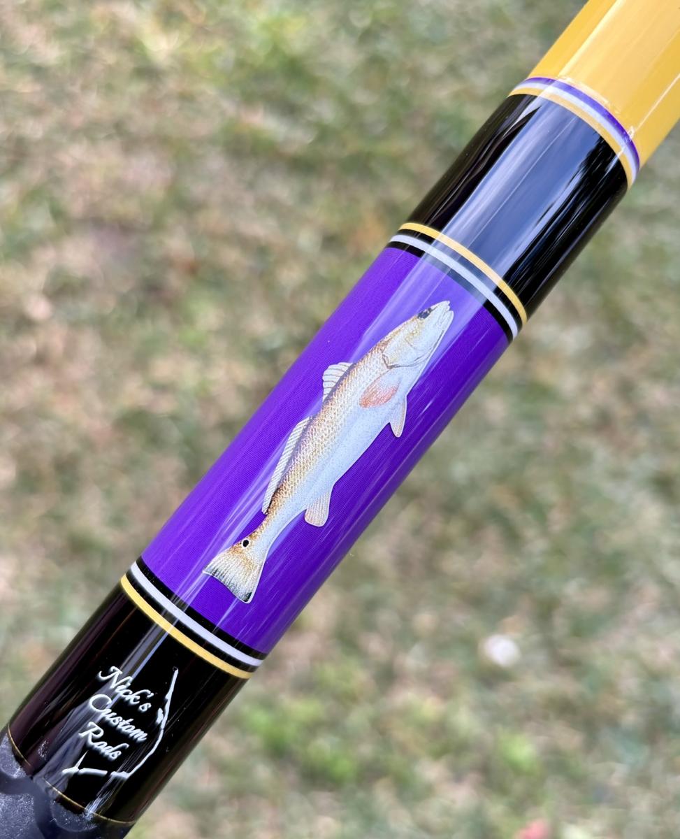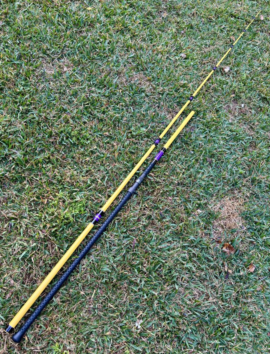 13′ Mississippi Gold, Unequal Sections, Tip Section is 106″ and the Butt Section is 55.25″. Fuji Trigger Reel Seat (29.5″ to start), Fuji Dark Gray Alconite Guides 25-12, Black Fishscale Heatshrink Fore & Full Butt Grips, Drum Decal. Rated for 6-10oz. PLEASE SELECT LOCAL PICKUP WHEN PURCHASING THIS ROD. If you are interested in having this item shipped, message us.